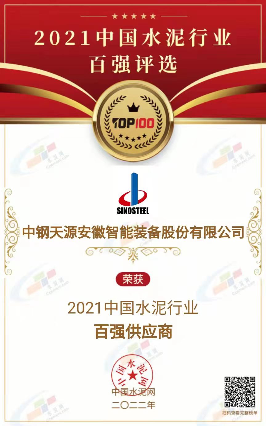 中鋼天源子公司獲“2021中國水泥行業(yè)百強供應(yīng)商”榮譽稱號
