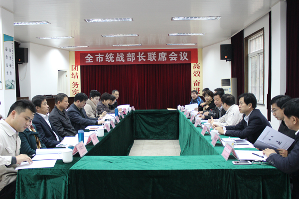市委常委、統(tǒng)戰(zhàn)部部長毛長江在最后的講話中強調(diào),全市各級統(tǒng)戰(zhàn)部門要進一步加強對十八屆四中全會等中央會議和文件的學習,深刻領會其精神內(nèi)涵,并著眼統(tǒng)戰(zhàn)工作實際抓好貫徹落實,具體做好2016年市級民主黨派組織換屆各項工作;進一步完善政府部門同民主黨派、工商聯(lián)對口聯(lián)系工作制度,規(guī)范特約(邀)人員統(tǒng)一推薦和聘任程序;切實做好經(jīng)濟領域統(tǒng)戰(zhàn)工作,引導非公經(jīng)濟人士增強定力、激發(fā)活力、釋放助力、提升能力;不斷完善工作機制、創(chuàng)新工作載體,扎實做好全市民族宗教工作;統(tǒng)籌做好港澳同胞與臺灣同胞、海外僑胞服務工作,積極為全市經(jīng)濟社會發(fā)展集聚智慧,貢獻力量。