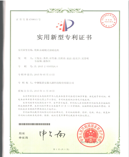 近日,中鋼集團(tuán)安徽天源科技股份有限公司又有一項(xiàng)實(shí)用新型專利——“粗粒永磁輥式強(qiáng)磁選機(jī)”喜獲國家知識(shí)產(chǎn)權(quán)局授權(quán),專利號(hào)為ZL201520305526.0。