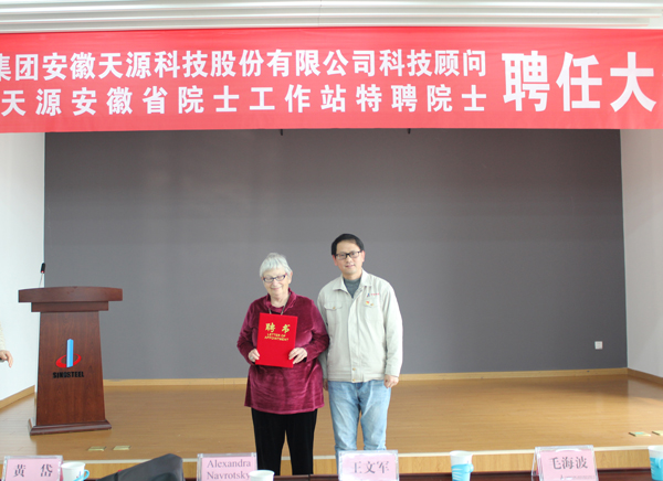毛海波總經理在會上介紹了Alexandra Navrotsky的簡況。隨后公司董事長、黨委書記王文軍與副總工程師裴曉東分別為Alexandra Navrotsky頒發了中鋼天源科技顧問、院士工作站特聘院士的聘書。聘任儀式結束后, Alexandra Navrotsky為參會人員作了主題為“A Career in Thermodynamics , Geochemitry and materials science”(熱力學、地球化學和材料科學領域的研究概況)的學術講座。