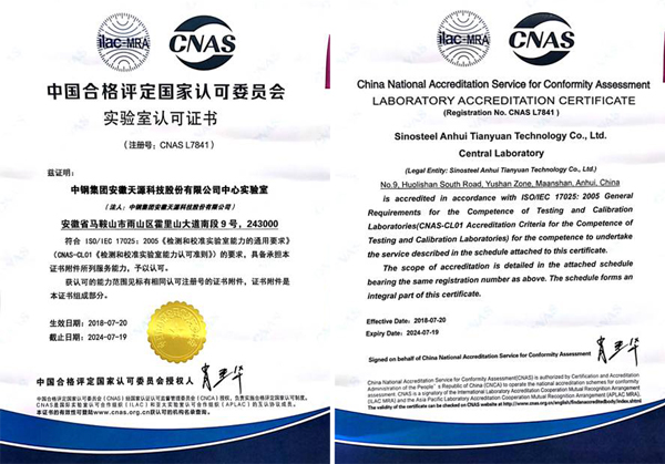 針對現場評審提出的問題和不符合項,中 心實驗室經過近1個月的整改,于2018年7月初將整改報告遞交至CNAS秘書處,CNAS于2018年7月20日向中鋼天源中 心實驗室頒發了實驗室認可證書。